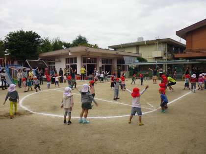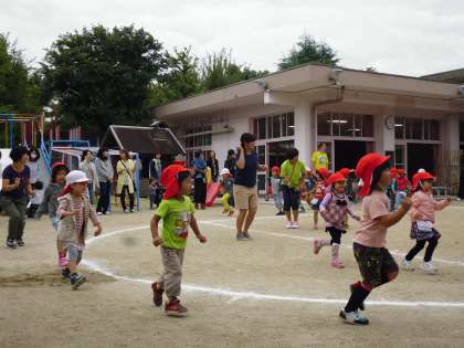 年長のそら組さんが、園舎にいる子どもたちに「体操が、はじまるよう」と大きな声で呼んでいます。一列に並んだそら組さんは毎日、はじめと終わりのあいさつをしてくれています。体操をみんなでして、「よーいドン」の時は、みんなで走ります。さあ、一日のスタートです。
