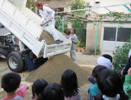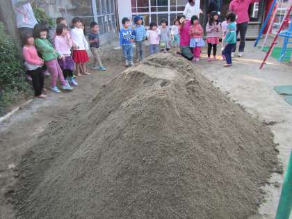 幼稚園に砂が届きました!みんなでトラックから落ちてくる砂を見ていると「大きいおやまになってきた!」「お兄さん忍者みたい!」おもしろいことがたくさんみつかります。また,お砂でいっぱい遊ぼうね!