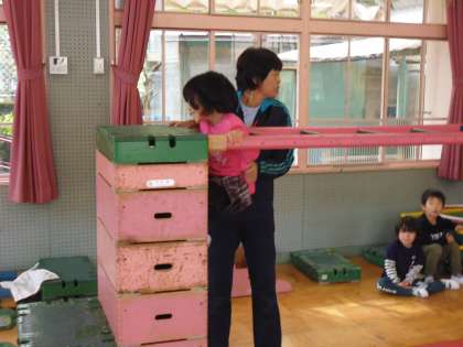にじ組のみんなは、遊戯室で巧技台を使って、うんていなどをしています。必死でぶら下がり、体を上手に揺さぶって前に進んでいきます。歯を食いしばって取り組んでいます。梯子の上を歩いたり、自分の背の高さぐらいの箱に飛びつき、ジャンプしています。