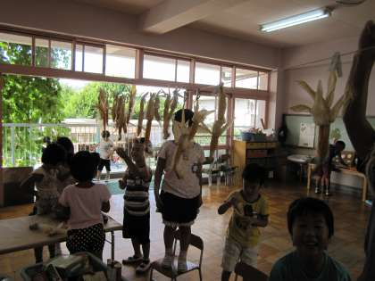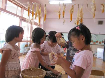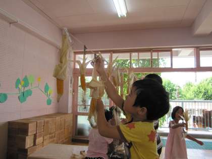 トウモロコシを収穫しました。乾燥させてポップコーンにしてみんなでいただきます。「早くポップコーン食べたいね」「こちらのもカチカチ」などと言いながら年長さん,部屋の紐につるしていきました。