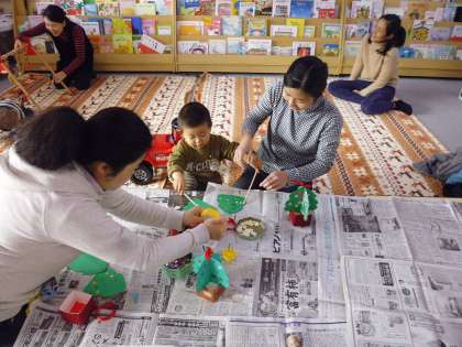 きょうのたんぽぽさんは、絵本室で過ごしています。クリスマスツリーを作っています。小さな飾りつけをお母さんと一緒に楽しんでいます。お母さんに読み聞かせをしてもらっている子もいます。おもちゃを使ってお母さんと遊んでいる子もいます。ほのぼのです。