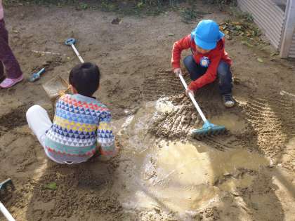 寒いけれども、お日様が出ていると、ちょっぴり暖かいです。三輪車やスケーターでピュンピュンかけまわっている子。遊具に上がったり、滑り台を登ったり、ブランコでゆらゆら。砂場は、久しぶりに子どもが集まってきました。クラスを超えて遊んでいます。テンテン大きな山を作ってトンネルを掘って・・・。お隣では、水を流し込んで何やら楽しそうです。サッカーに打ち込んでいるそら組さんも、見ていておもろかったです。いつも真剣に遊んでいますよ、子どもたち。