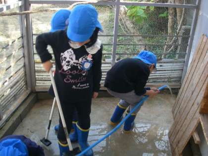 そら組さんは、チームごとに当番を決めて、禽舎の掃除をしてくれています。はじめは、担任の先生と一緒にしていましたが、今ではほとんど自分たちの力で、きれいにしてくれています。