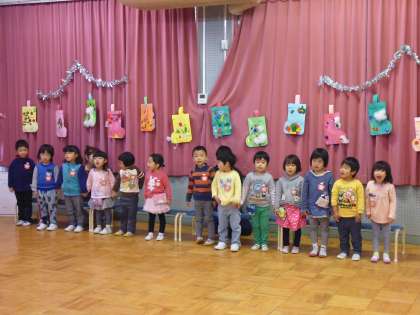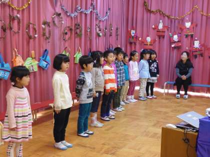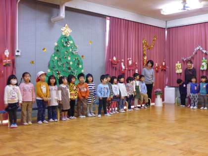 楽しい集いが始まりました。各クラスから歌のプレゼント。子どもたちの楽しい歌声が空高く響いているかな、サンタさんに届いているのかな。鈴の音が聞こえてきて、サンタさんが幼稚園に来てくれました。サンタさんから一人一人プレゼントをいただきました。どの子も神妙な表情でした。「わたしのおうちにも来てくれるかなあ」