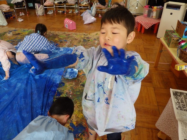 今日は「みんなで大きな海をつくろう!」と絵の具遊びをしました。