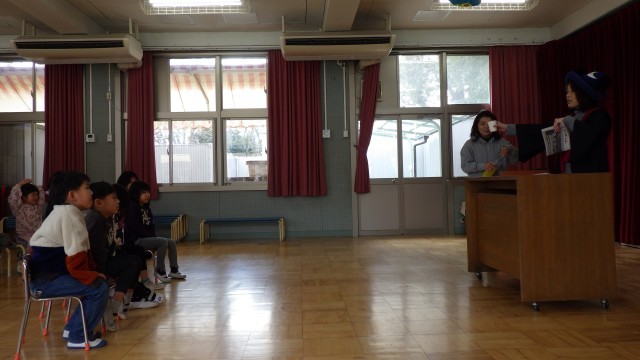 こどもお別れ会のお楽しみは園長先生のマジックショーです!不思議な色の変わる水、突然大きくなるボールペンなど不思議な魔法の数々を見せていただきました。