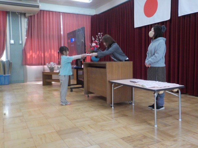 終業式では、みんなで大きくなったことを喜んだり、保護者の方がつくってくださった「くものさんちゃんものがたり」の絵本の読み聞かせを通して、そら組さんが大事にしていたさんちゃんに思いを寄せたりしました。