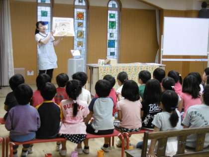 まずは5歳児です。歯ブラシとコップを持って遊戯室に集まりました。どうしたら虫歯になりやすいかということを紙芝居を通して教えていただきました。