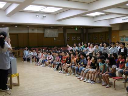 先生がおっしゃるように歯ブラシを持ちかえながら,磨いていました。磨いた後はしっかりうがいでゆすぐこと,歯ブラシもきれいに洗って乾かしておくことも教えてもらいました。さあ,今日から「こんにちは」と「さようなら」のもち方でしっかり磨いていきましょうね。