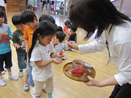誕生会で、収穫した苺をジャムにして食べることにしました。アレルギー体質の子どもたちがいるのですが、苺と砂糖とレモンは大丈夫です。パンやクラッカー、せんべい等何かに付けて食べることを検討したのですが、同じ物を食べるのには無理がありました。それで結局、ぺろりと舐めることになりました。スプーンですくって掌に載せてもらいあっと言う間でしたが、子どもたちは満足そうでした。たとえ量はわずかでもみんなで分けて食べたからでしょう。きっとおいしい思い出になったことでしょうね。
