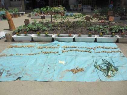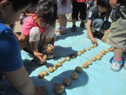 昨年度種イモを植えたじゃがいもが土の中から少し顔を出し,そろそろ収穫かな?と土を掘ってみた子どもたち。中からたくさんのじゃがいもが出てきました。大きなおいも,小さなおいも,いろいろたくさん見つけると,「いっぱいある!」「大きいのおいしそう」と早速食べてみたいとあれこれ思いをめぐらせます。畑からも,プランターからも・・・あまりにたくさんのおいもなので,並べて数えてみることにしました。1,2,3・・・なんと310個もあったのです。この数に子どもたちもびっくり!前に収穫した玉ねぎと一緒にカレーをつくってみんなで食べたいと計画中です。