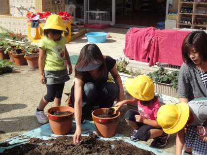 キュウリは苗から親子で大切に育て、大きくしていったのですが、今度は種からにしました。親子で土を入れ、種をまき、水をやり・・・