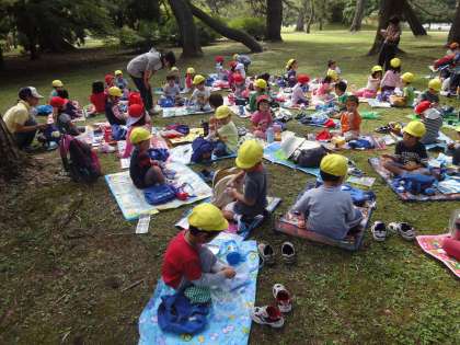皆でいっぱい歩いて付いた場所で一緒にお弁当をたべました。