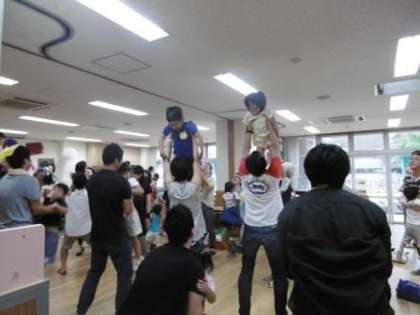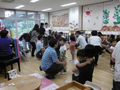 お家の方と一緒に触れ合って,ギュッと抱っこしてもらった3歳児や高い所まで抱き上げてもらった4歳児,手をつないで輪取りゲームを楽しんだ5歳児など,どの子どもたちもとても嬉しそうでした。