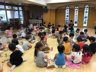 園外保育から帰り,ほっと一息の子どもたち。今日のおやつは宿泊保育特別バージョンの機関車クッキーと列車ラムネ,フルーツジュースでした。鉄道博物館での楽しかったことを友達や先生と話しながらのおやつタイムでした。また,みんなで行きたいね。