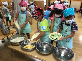 続いてのお楽しみは,カレー作り。宿泊保育で一番したかったことが「自分たちで料理をして食べる」ということでした。カレーパーティーの経験からカレー作りには自信をもっている子どもたち。どんな準備が必要か?どんな材料で,手順は?とみんなで話合い,エプロンをつけてお料理開始。「何からする」「私がじゃがいも洗うわ」などとグループの友達と声を掛け合いながら進めていきました。今日はもえぎティンクルの方にも手伝っていただき,安全にお料理できるよう見守り,手伝ってくださいました。