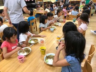 幼稚園の畑で収穫したキュウリや賀茂ナスも入ったスペシャルカレーです。いい匂いが幼稚園中に漂い,いよいよみんなで食べようとしたのですが・・・「あれっ?ばばばあちゃんまだ来ないのかな?」「もうカレーできたのに」「また,お昼寝しちゃったのかな?」とばばばあちゃんを心配する子どもたち。実は,前回のカレーパーティーに寝坊してこられなかったばばばあちゃんを今日のカレーにご招待していたのです。ところが,ばばばあちゃんは現れません。そこで子どもたちは,ばばばあちゃんがいつ現れても大丈夫なように,机にばばばあちゃん用のカレーを準備し,お手紙を添えました。そして,「みんなでいただきます」そのカレーのおいしかったこと!!野菜が苦手だった子どもも幼稚園の畑で採れる野菜はおいしくいただくことができました。みんなでつくったカレーはとってもおいしかったね。ティンクルさん,ありがとうございました。