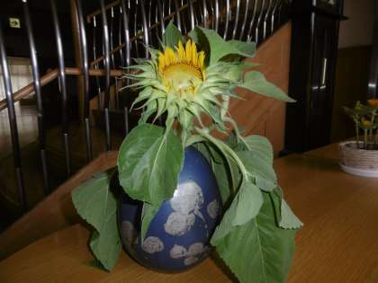 折れてしまったヒマワリは,短くして花瓶に入れて玄関で様子を見ていました。今日,だんだん花が開きそうになっていました。背の高い茎のてっぺんで咲くヒマワリの花の予定だったのに,ヒマワリさん自体がびっくりしているかのしれませんが,花瓶の中ででも花を咲かそうとしてくれていて,「あ〜よかった」と思い嬉しくなってお水を一杯入れて,水がしっかり吸い上げられるように茎も少し短くしておきました。しっかり咲いてくれることでしょう。