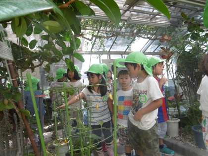 チョウの家では,珍しい沖縄のチョウチョがたくさん飛び回ったり,蜜を吸ったり葉っぱに止まったりしているのを一生懸命見ていました。「僕の手に5回もとまった」「私の頭にもとまった」と嬉しそうに話す子どもたちもいました。