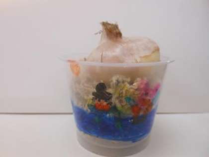 祖父母参観の日,おじいさん,おばあさんへサフランの球根をプレゼントした子どもたち。予備でクラスに置いていたサフランの球根を見つけると,「さふらん,ばばばあちゃんにもあげたらどう?」「だって,ばあちゃんだもんねえ」と相談し始めました。そして,プレゼント用にカップに絵をかき,手紙を添えて,いつものように畑に置いておくことにしました。