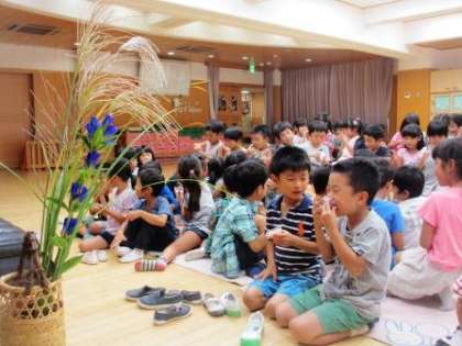 4日は,中秋の名月。幼稚園では一足早くお月見の集いをしました。学年で集い,お月様の話をしたり絵本を見たりして,明日の夜,きれいなお月様に会えますようにお願いをしながら,お月見団子をいただきました。