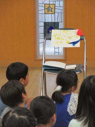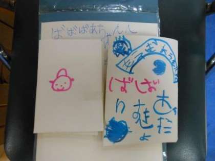 雨の園庭,ふと2階のテラスから畑を見ると,手紙が!!「ばばばあちゃんから手紙が来たよ!」と大急ぎで手紙を開けると,明日の先日のサフランのお礼と運動会に応援に来てくれるとのこと。明日の運動会がもっと,もっと楽しみになりました。そこで,ばばばあちゃんの席を用意しようと考えた子どもたち。お客さんの席に座ってほしいと案内をかき,椅子に貼りました。そして,来てくれてありがとうのお手紙やお土産をつくって,封筒に準備しました。明日の運動会ではばばばあちゃんの応援を受けながらみんなで頑張ります。