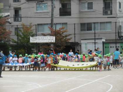 5歳児のリレーの走りっぷりは本当に見事でした。毎日4チームが勝ったり負けたりしながら対戦してきました。まさしく勝った喜びや負けた悔しさを味わいながら,「何で今日は負けたんだろう」「どうしたら勝てるだろう」とチームで振り返り,相談したり,作戦を立てたりして今日の日を迎えました。