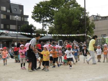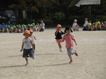 『走る』ということは『かけっこ』だけではありません。3歳児の追いかけっこも「走る」ことです。「よーいどん!」と走るだけでなく大好きな先生や友達を追いかけるということは楽しく嬉しい事です。「よーいどん!」のかけっこの苦手な子どもたちもおいかけっこなら思い切り走るということもできます。いろんな『走る』を経験していってもらいたいと思っています。