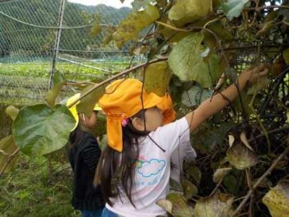 その後,5歳児はばばばあちゃんの家を探しに探検に出かけ,4歳児は雨の止み間を見つけてキウイを収穫させていただいたり,和室でみんなでダンスをしたりして楽しんでいると,すぐにお昼になりました。