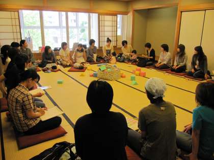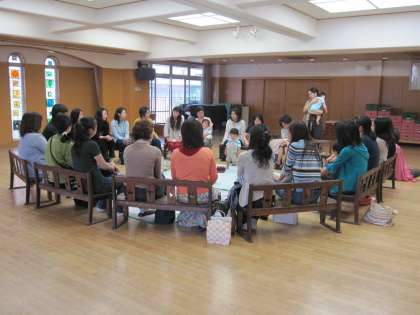 保育時間中の空いた部屋で各組の懇談会をしています。家庭訪問が済んだこの時期に子どもたちの姿を話したり大人のかかわりを考えたりする機会になればと思っています。各家庭に配布された「家庭教育の手引き」も参考資料にしたりしています。子育てのやりがいを確認したり、悩みや相談事が話題に出されたりします。みんなで子育てが出来、みんなが育ち合う幼稚園でありたいと願っているところです。