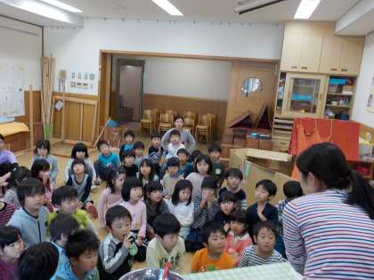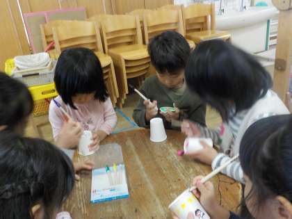 その後,たんぽぽ組・ひまわり組も2階に行き,ポップコーンができる様子を見たり,ポップコーンを入れるように紙コップに絵をかいたり,食べる準備を一緒にしました。幼稚園大会の歌などを聞かしてもらってあこがれていたお兄さんお姉さんと一緒に準備をすることがとても嬉しく,絵をかくときも寄り添いながら楽しんで書いている姿がありました。