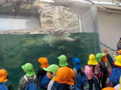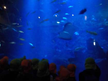 京都水族館に着くと,「来たことある」「エイがいるよ」「サメもいた」と思い出したことを伝え合う子どもたち。今からどんな魚が見れるか,とてもワクワクしていました。