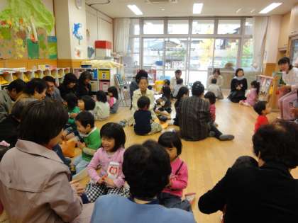 好きな遊びの時間では,子ども達が園庭や保育室で思い思いに好きな遊びを楽しむ姿を,そばで目をほそめてみてくださっている祖父母の方の顔が印象的でした。