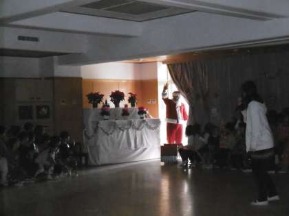 今日は幼稚園の楽しいつどいの日でした。遊戯室には,クリスマスツリーを始めきれいなクリスマスの装飾,キャンドル,子どもたちのつくったプレゼントバックなどがいっぱい。クラスごとにいつもと違う素敵に変身した遊戯室をゆっくり見て回り,椅子に座りました。♪サンタクロース♪の歌を全員で歌ったり,クラスごとにクリスマスのいろいろな歌を歌ったりしました。