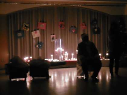 そしてキャンドルに火をともし,電気を消すと子どもたちから「わ〜きれい」と思わず声が聞かれました。真っ暗中にキャンドルの灯りだけ灯っているのは本当に幻想的な雰囲気でした。そんな中に,「リンリンリン・・・」と鈴の音が聞こえてきました。