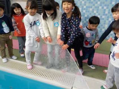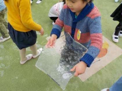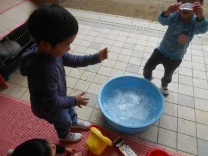 子どもたちは氷で遊ぶ中で,分厚くて大きい氷の重さに驚いたり,氷と水の冷たさを肌で感じたりと,この時期にしか味わえない季節感を感じていました。今後もその季節ならではの遊びの楽しさを十分に味わい,季節を感じていきたいと思います。