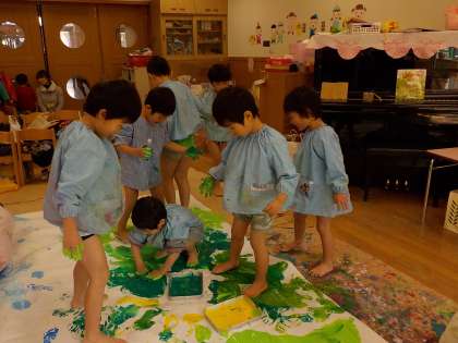 久しぶりの全身を使っての絵具遊びだったので、足につけてスケートをすることも思い切り楽しんでいました。ちょっと滑っても、それが楽しいという姿でどんどん色々な色が重なっていき、とってもきれいな森が出来上がりました。