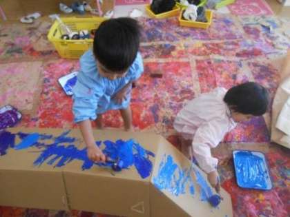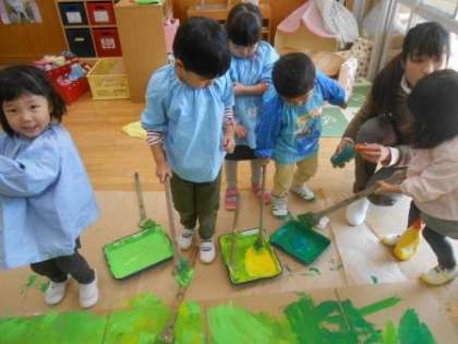 今日はよく晴れた日だったので,久しぶりにもも組とちゅうりっぷ組は絵の具遊びを楽しみました。もも組はローラーやスポンジを使って段ボールに赤色や青色,黒色,灰色,紫色と色とりどりの絵の具を塗って楽しんでいました。ちゅうりっぷ組はハケを使って緑色や黄色の色を段ボールに塗って楽しんでいました。3学期にも入り,子どもたちはますます自分のことを自分の力でできるようになってきて,スモックに着替えることや足や手についた絵の具を洗い落とすこともお手の物です。これからも子どもたちがどんどん大きくなっていくことを楽しみにしています。また絵の具遊びもしようね。