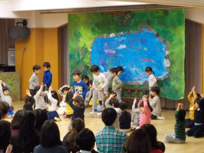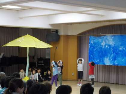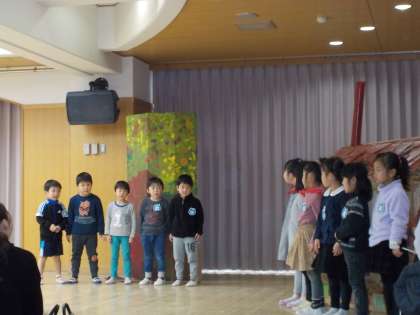 朝から嬉しそうに登園してきた子どもたち。クラスの友達と一緒に劇遊びをしたり,歌をうたったり,元気いっぱいの声が遊戯室から溢れていました。たくさんのお客さんに緊張しながらも,一生懸命表現したり,言葉を言ったり,楽しんで遊ぶ姿が見られました。たくさんの拍手をもらって退場する子どもたちの顔は,とてもいい表情でした。
