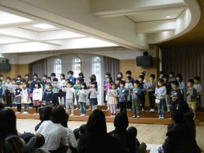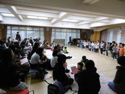 今日は,4月から中京もえぎ幼稚園に入園される新しいお友達をお招きしての半日入園でした。新しいお友達に在園の子どもたちが先日の生活発表会で歌った歌や合奏を中心に聞いてもらいました。