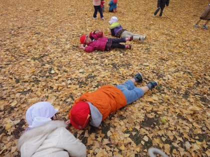 初めはそのじゅうたんの坂道を走ったり,葉っぱを集めたりして楽しんでいたのですが,次第にコロコロ転がって楽しむ姿にかわり目で,体で,心いっぱい遊びました。