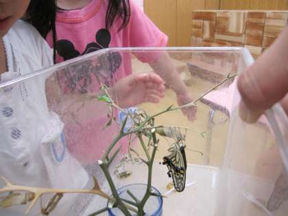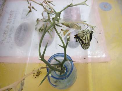 蛹から蝶へ、その瞬間を見たいとチャンスをうかがっていますがなかなかうまくいきません。さなぎが黒く変色してきて・・・もうすぐ・・・でもやっぱり今日も後一歩のところで残念でした。生まれたてで羽を閉じたままじっとしています。「びっくりするよ、静かに!」「落ちてしまうで、そーっとしいや」周りにやさしさが伝わっていきました。まだ蛹がいます。つぎは見られるでしょうか?