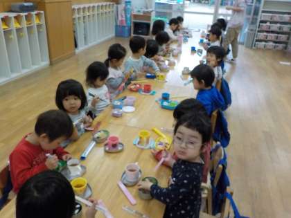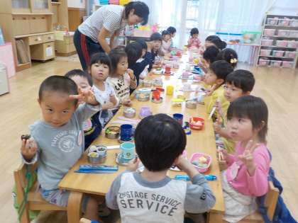 今日は,3歳児にとって初めてのお弁当日でした。朝から「たまご焼き入ってるの」「きのこも食べられる」とお弁当を楽しみにしている様子でした。