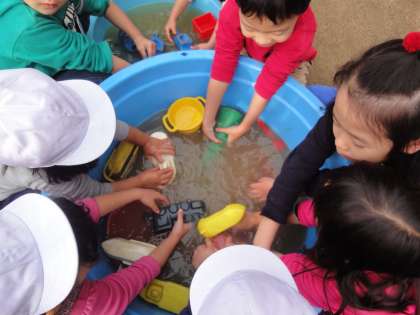 砂場のおもちゃは幼稚園のみんなで、ついていた砂を払って洗いました。