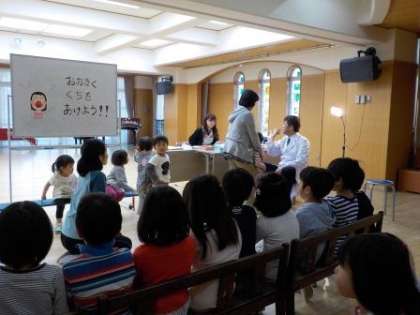 3歳児にとっては初めての検診でしたが,5歳児のお兄さんお姉さんが検診を受ける姿を見せてもらい,落ち着いて受けることができました。初めての経験でドキドキしている様子の子どももいましたが,頑張って口を大きく開けて診てもらっていました。4歳児・5歳児は歯科検診を受けたこともあり,とても落ち着いて診てもらいました。園医さんにも「とってもかしこいね」とお褒め頂きました。歯は一度虫歯になるとなかなか治らないものです。毎日の歯磨きを丁寧にして,歯を健康に守っていきたいですね。