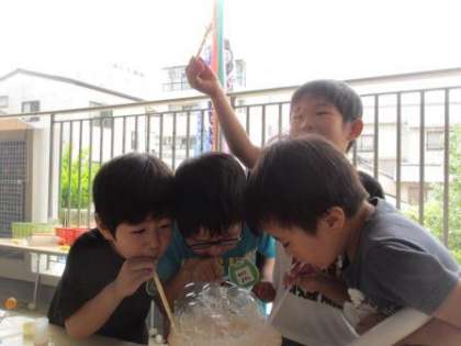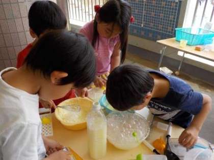 そして,トロリとした石鹸の液ができ「ストローで吹いてみたい!」と子どもたちから声が上がり,石鹸水を吹いてみると・・・ブクブクとたくさんの泡が出てきました。