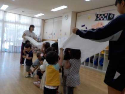 最初はこいのぼりに使う白い布を使って隠れてみたり、一緒にばたばた揺らしたりして楽しみました。