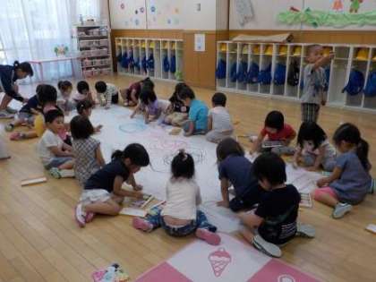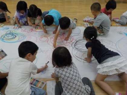 「これは実はこいのぼりなんだけど、何も模様がなくてさみしいね。みんなで絵を描いてあげよう。」という先生の言葉で勢いよく描き始めました。「大きな卵だよ。」「虹を描いたよ。」「全部の色を使うの。」とそれぞれが思い思いの絵を描いていました。白いところを上手に探して描いている子もおり、おかげで一面カラフルな素敵なこいのぼりが出来上がりました。