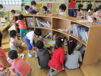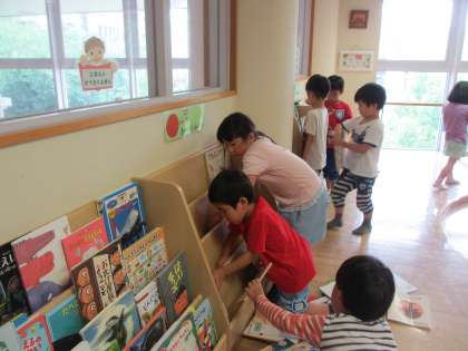 さっそく4歳児年中組の親子が降園時に絵本を借りに行き,気持ち良く使うことができました。大きい組さんありがとう!!
