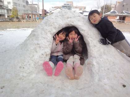 お母さんたちが公園の雪を集めて、かまくらを作ってくださいました。